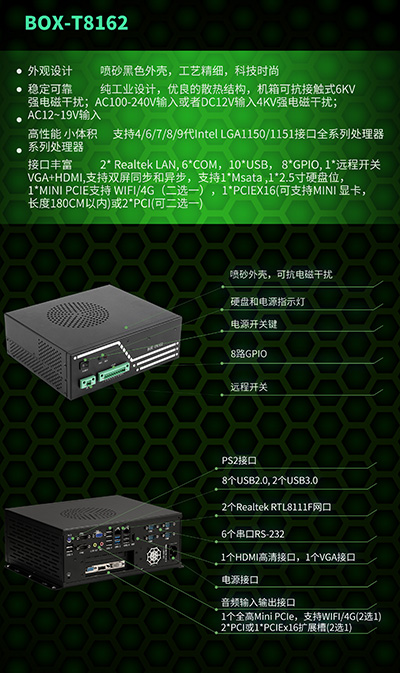 BOX-T8162是一款高性能、小體積、可擴展工控機,桌面式或壁掛式安裝,降低了機箱內部噪聲,同時增加了GPU散熱通道。BOX-T8162支持Intel® LGA1150/1151針腳的第4/6/7/8/9代全系列處理器,支持高性能浮點運算,速度最快可以達到128GFLOP/s。支持擴展全高半長的擴展卡,多擴展總線提供良好擴展性能。機箱可抗接觸式6Kv強電磁干擾,整機小巧,功能強大,適用于工業物聯網、機器視覺等應用。