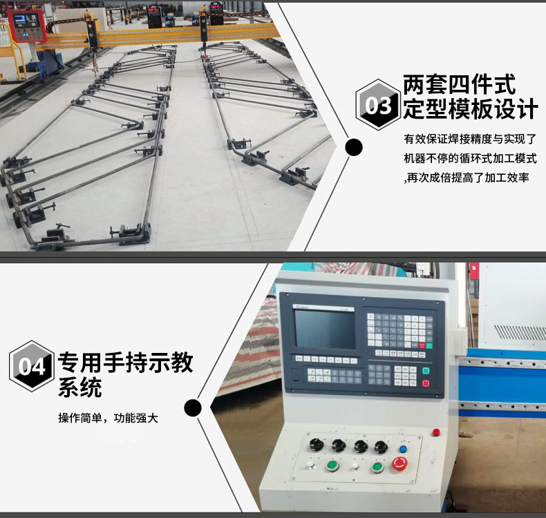 獨創的龍門式結構;機械結構合理,性能穩定與加長與維修方便;雙焊設計;成倍提高加工效率;兩套四件式定型模板設計;有效保證焊接精度與實現了機器不停的循環式加工模式;再次成倍提高了加工效率。公司開發的焊接機器人專用手持示教系統:操作簡單,功能強大。